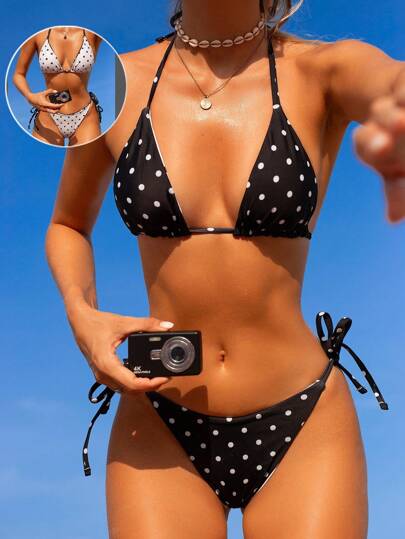 Swim Mod 双面两件套女士泳衣,波尔卡圆点设计,适合度假温泉游泳比基尼套装 - 黑與白 - 查看 1