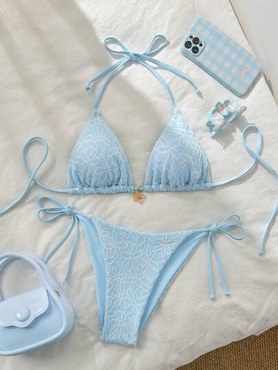 Swim Mod 纹理吊带三角比基尼套装 带系带侧泳裤 夏季 - 彩色 - 查看 1