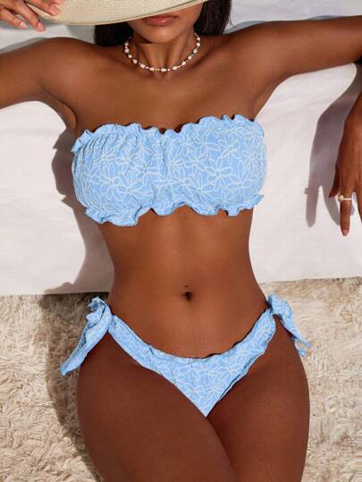 Swim Mod 女士荷叶边花卉印花时尚比基尼套装 - 淺藍色 - 查看 1