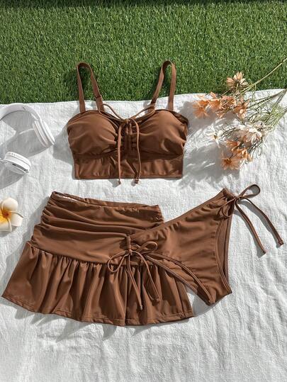 Swim Mod 女士休闲度假沙滩派对优雅纯棕色粗肩带复古乡村风比基尼沙滩三件套,夏季