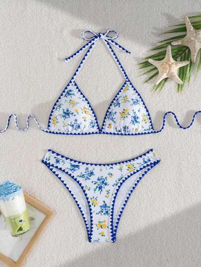 SHEIN Swim 女士新款碎花荷叶边露背上衣和比基尼套装,时尚设计夏季 - 彩色 - 查看 1