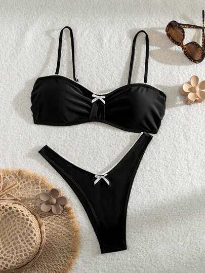 Swim Mod 女士褶饰细肩带露背上衣和蝴蝶结下装比基尼套装夏季 - 黑色 - 查看 1