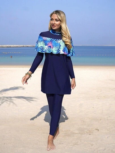 Swim Mulvari 三件套:热带树叶印花和纯色无袖背心、长袖荷叶边沙滩裙、蓝色打底裤、优雅修身女士泳装