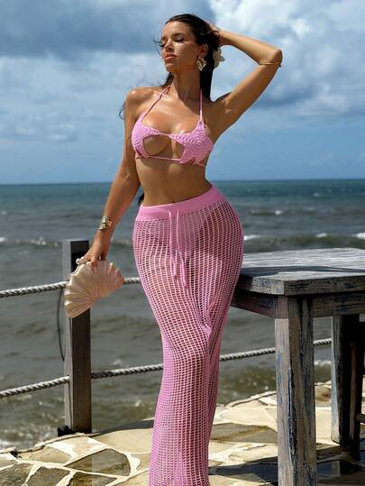 Swim SXY 女士钩针海星吊带上衣和针织长裙两件套,粉色,海滩度假风 - 粉色 - 查看 1