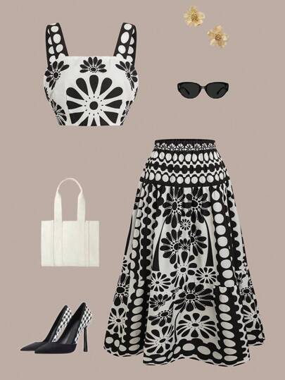 Chiquease 2 件女士优雅时尚套装:无袖吊带背心和图案裙,适合派对、毕业典礼、户外活动、春夏季 - 黑與白 - 查看 2