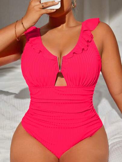 Swim Vcay 大碼V型缺口荷葉邊褶邊連體泳衣 - 粉色 - 查看 1