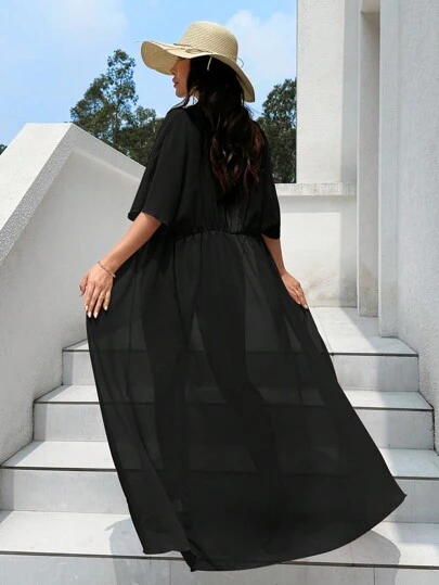 Swim Vcay 素色前繫帶和服罩衫 - 黑色 - 查看 1