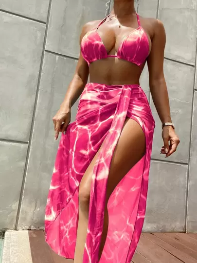 Swim Vcay 紮染掛脖三角杯比基尼泳裝附沙灘裙 - 玫紅色 - 查看 1