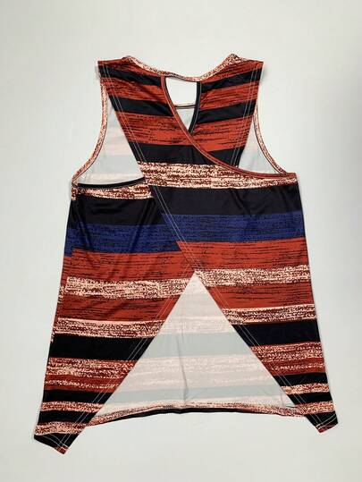 条纹印花无袖交叉后背休闲背心,夏季图案 T 恤女上衣 - 休闲圆领无袖背心,休闲度假装女士 - 彩色 - 查看 1
