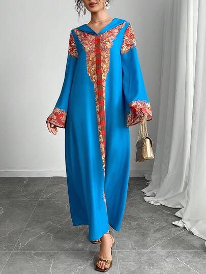 优雅宽松连帽长袖长袍,轻盈透气休闲长袍,度假风格长袍,传统阿拉伯服装,节日长袍 - 寶藍色 - 查看 1