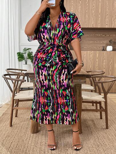 SHEIN Clasi 大码女式全身印花V领蝙蝠袖鱼尾下摆连衣裙 - 黑色 - 查看 1