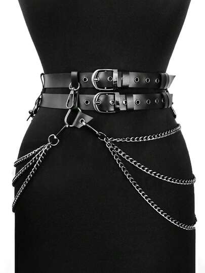 女士黑色性感 PU 皮革紧身胸衣腰带,带链条装饰,哥特式时尚配饰,适合狂欢 - 黑色 - 查看 1