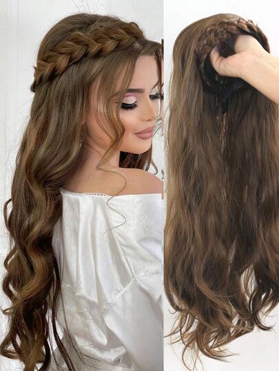 合成发带,配有长波浪卷发接发和编织发片,浅棕色,自然半巫婆发饰 - Light Brown - 查看 10