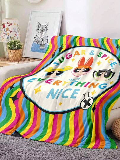 THE POWERPUFF GIRLS X SHEIN 1 件花朵、泡泡、毛茛图案柔软毛绒毯子,适合卧室客厅的礼物 - 彩色 - 查看 1