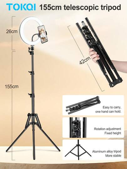 TOKQI 155厘米/61.02英寸LED灯,26厘米/10英寸旋转环形灯,带灵活手机支架,3种色温,10级亮度,可伸缩三脚架,适用于直播、摄影、视频录制、化妆、自拍,兼容智能手机 - 環形補光燈+支架套裝 - 查看 10