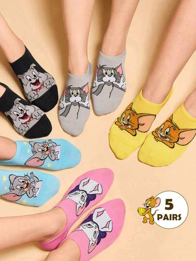 TOM & JERRY X SHEIN 5双女士透气吸湿排汗薄款隐形袜子,卡通可爱猫、老鼠、狗图案,加固后跟,适合春夏季 - 彩色 - 查看 1