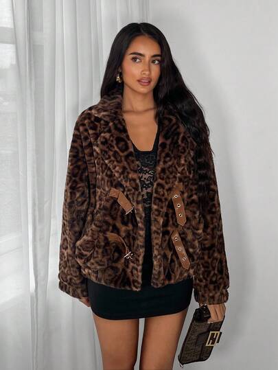 TRNVIE 1 件女式常规夹克,棕色豹纹仿皮草领带腰带,复古宽松风格,冬季 - 棕色 - 查看 7