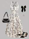 SHEIN Girlism 少女复古花卉印花交叉肩带优雅雪纺连衣裙,适合文艺复兴博览会