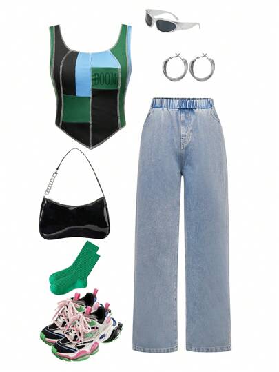 少女夏季不對稱領口字母印花無袖上衣和長褲休閒兩件套裝 - 彩色 - 查看 1