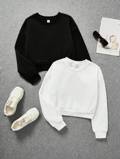 青少年女孩2入組素色落肩袖運動衫 - 黑與白 - 查看 1