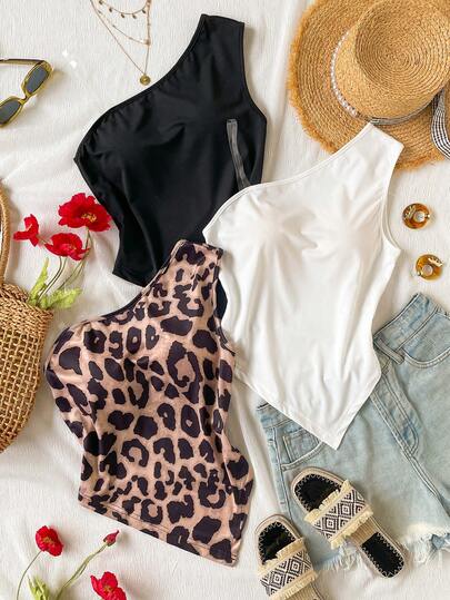 少女不对称下摆单肩背心,夏季 - 彩色 - 查看 1