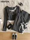 少女条纹领蝴蝶结印花长袖运动衫和百褶迷你裙休闲装,秋季