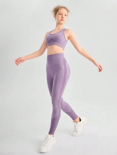 SHEIN 青少女運動健身套裝,包括桃臀彈力背心和長褲,適用於戶外運動 - 棕色 - 查看 1