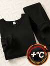 SHEIN 2 件套青少年女孩黑色保暖针织长袖上衣和打底裤打底衫套装,秋冬