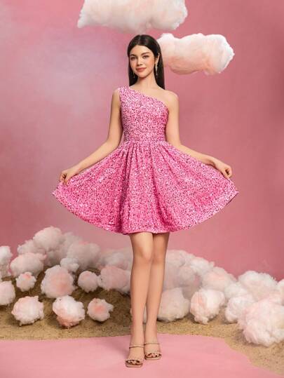 少女优雅单肩亮片 A 字形毕业礼服 - 适合生日、选美、毕业晚会和颁奖典礼的闪亮派对礼服 - 粉色 - 查看 2