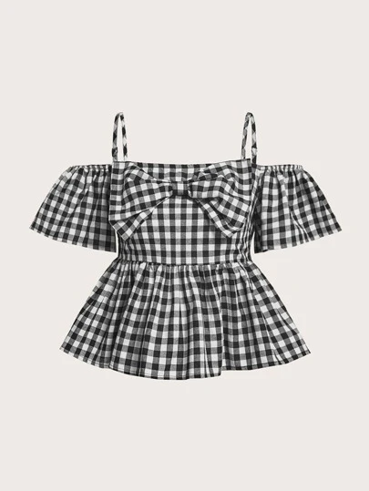SHEIN 青少年女孩雙色格子挖肩前蝴蝶結荷葉邊下擺襯衫