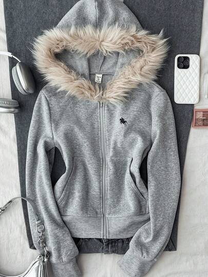 少女印花口袋卫衣 - 灰色 - 查看 1