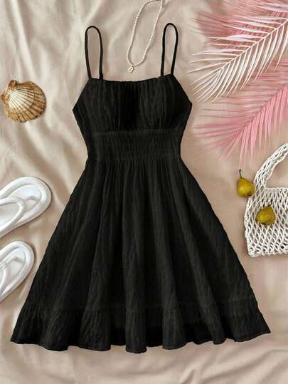 SHEIN 少女夏季休闲度假纯色荷叶边无袖吊带连衣裙,适合夏季约会之夜、海滩度假、女生郊游、海滩度假装扮、女士太阳裙