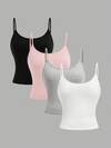 SHEIN Girlism 4件套少女黑色、白色、灰色U领修身吊带背心,百搭休闲上衣,适合所有季节,基础款上衣,3件装,修身款上衣,基础款上衣