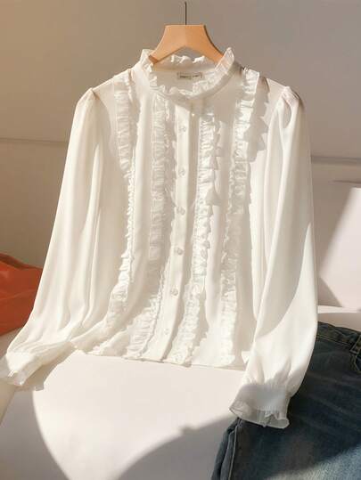 青少年白色衬衫,耳叶形蕾丝花边,长袖儿童衬衫,适合春秋季穿着,百搭女童立领上衣,学院风女童服装,珍珠纽扣儿童服装 - 白色 - 查看 7