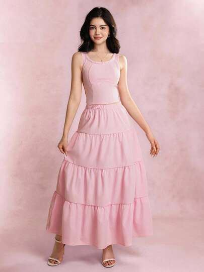 青少年(女孩)两件套服装,春夏休闲优雅,包括粉色无袖蝴蝶结吊带衫和粉色长裙 - 粉色 - 查看 1