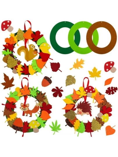 感恩节、圣诞节和秋季花环套装,秋季枫叶和刺猬花环。亲子手工艺术品,闪亮贴纸,毛毡秋季枫叶贴纸DIY手工套装。家居、教室和派对节日装饰,感恩节、圣诞节和万圣节节日装饰工具包 - 彩色 - 查看 1
