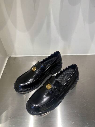 厚底珍鞋,配有茶花細節,經典黑色,按摩卵石鞋墊,復古單扣皮鞋,厚跟和毛絨襯裡,秋冬新款 - 黑色 - 查看 1