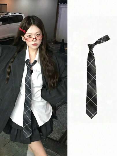 这款经典的格子领带专为学生JK制服设计,采用深灰色和黑色格子图案,与学校的西装外套、衬衫和裙子完美搭配,营造出甜美的校园氛围。
