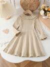 女童圆领粉色套头针织连衣裙,蝴蝶结装饰长袖针织休闲优雅连衣裙,带蓬松绒球,温暖舒适,适合秋冬日常穿着