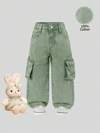 女童新款黑色水洗休闲宽松时尚可爱蝴蝶结刺绣休闲工装牛仔裤,多口袋,百搭时尚,适合日常穿着