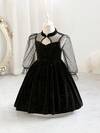 Glamorique Kids 年轻女孩优雅优雅奢华黑色网眼波尔卡圆点镂空长袖黑色天鹅绒蕾丝连衣裙,正式服装