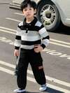 两件套男童休闲校园风服装,白色菱形麦穗格纹拼接黑白罗纹马术刺绣长袖上衣和裤子,修身款,适合春秋季穿着。