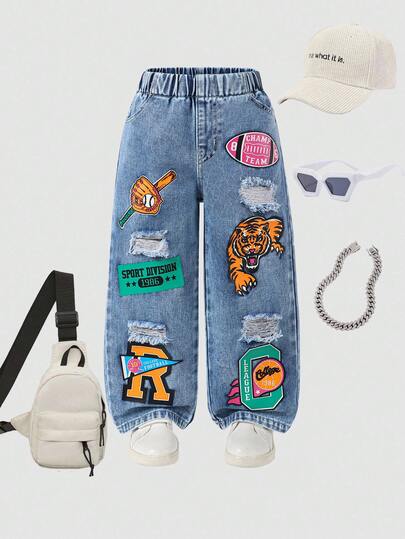 幼儿男童个性酷炫时尚街头纸浆印花多元素做旧松紧腰口袋牛仔裤 - 淺色水洗藍 - 查看 1