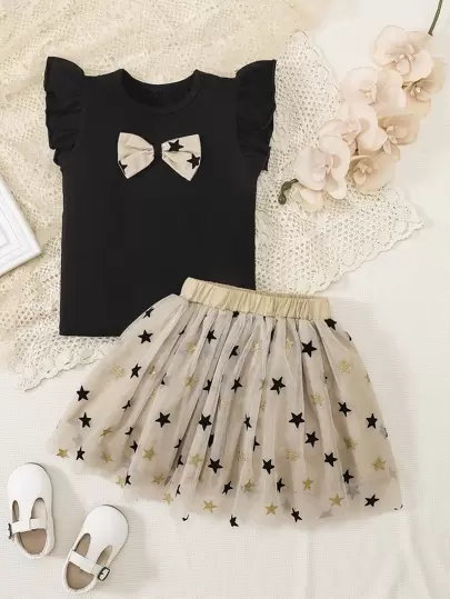 SHEIN 小女童前蝴蝶結荷葉邊T恤和星星網紗覆蓋半身裙 - 彩色 - 查看 1