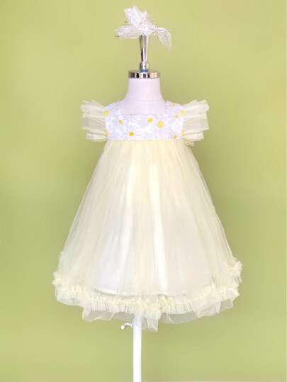 小女童花卉刺繡荷葉邊網紗覆蓋連衣裙 - 黃色 - 查看 1