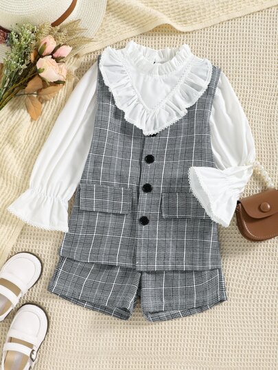 小女童格紋印花馬甲和荷葉袖襯衫和短褲 - 彩色 - 查看 1