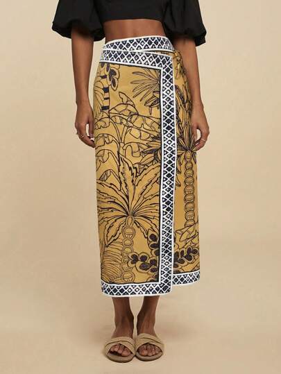 Travachic 棕榈树印花围裹式前系带半身裙,度假风格 - 卡其色 - 查看 1