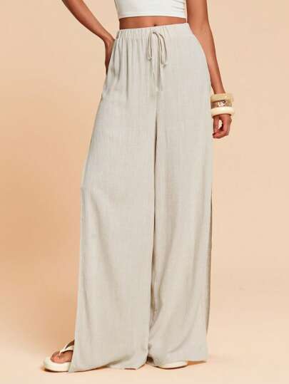 Travachic 繫腰帶開衩闊腿褲 - 卡其色 - 查看 1