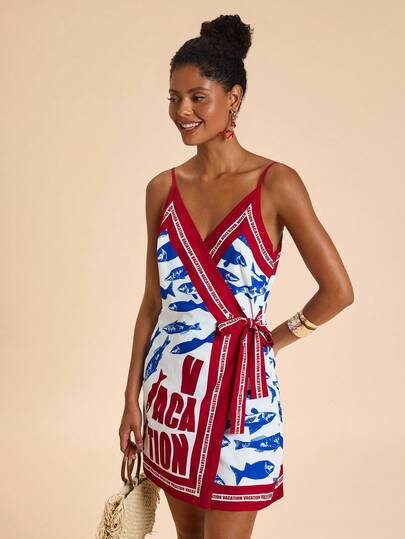 Travachic 女士度假休闲鱼和字母印花系带吊带背心连衣裙