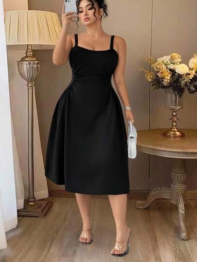 Auvina 大码女式纯色优雅低领细肩带连衣裙 - 黑色 - 查看 1